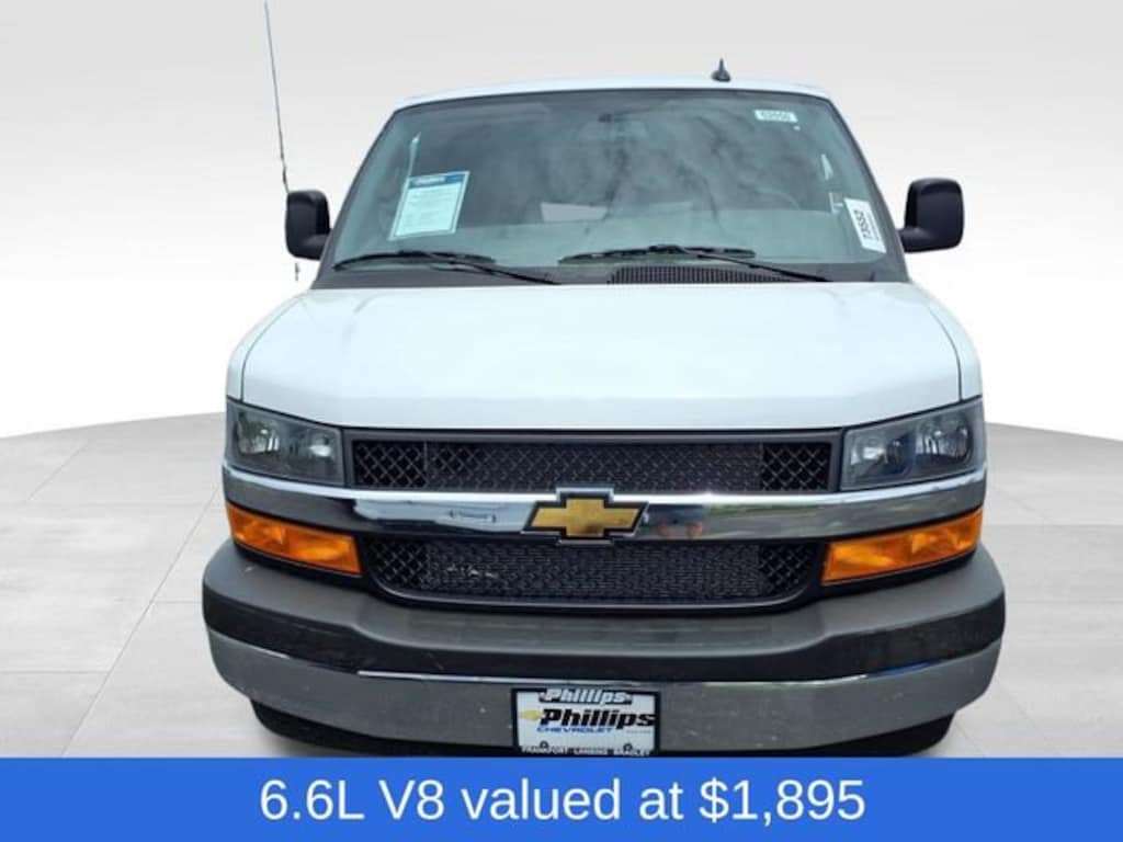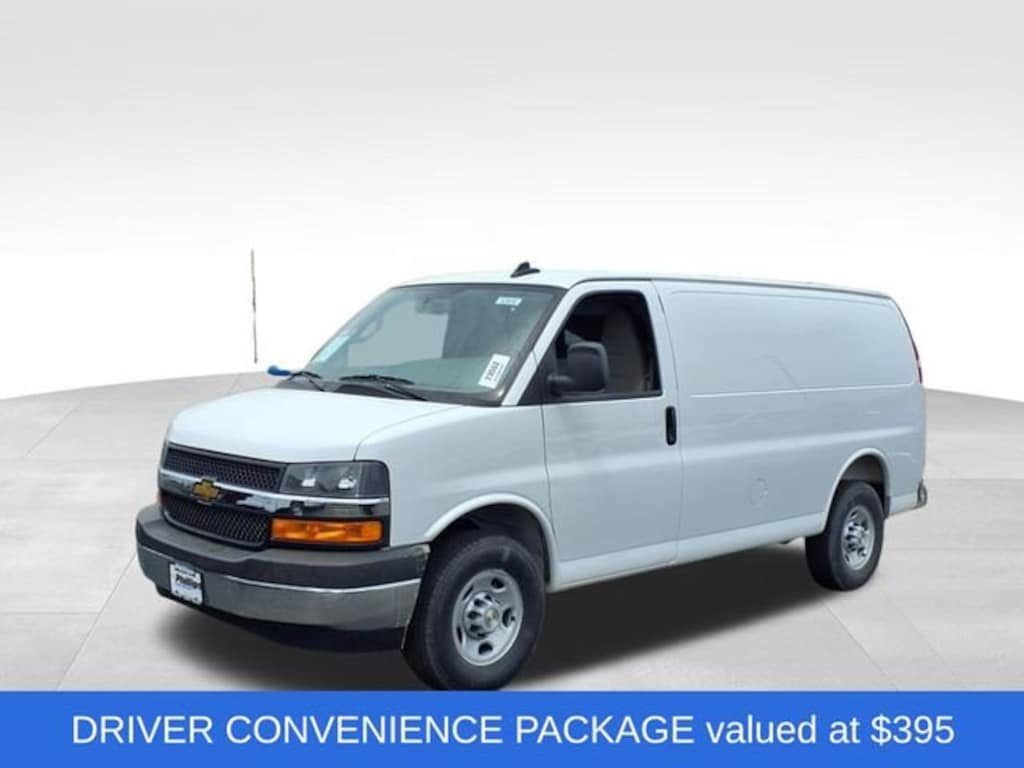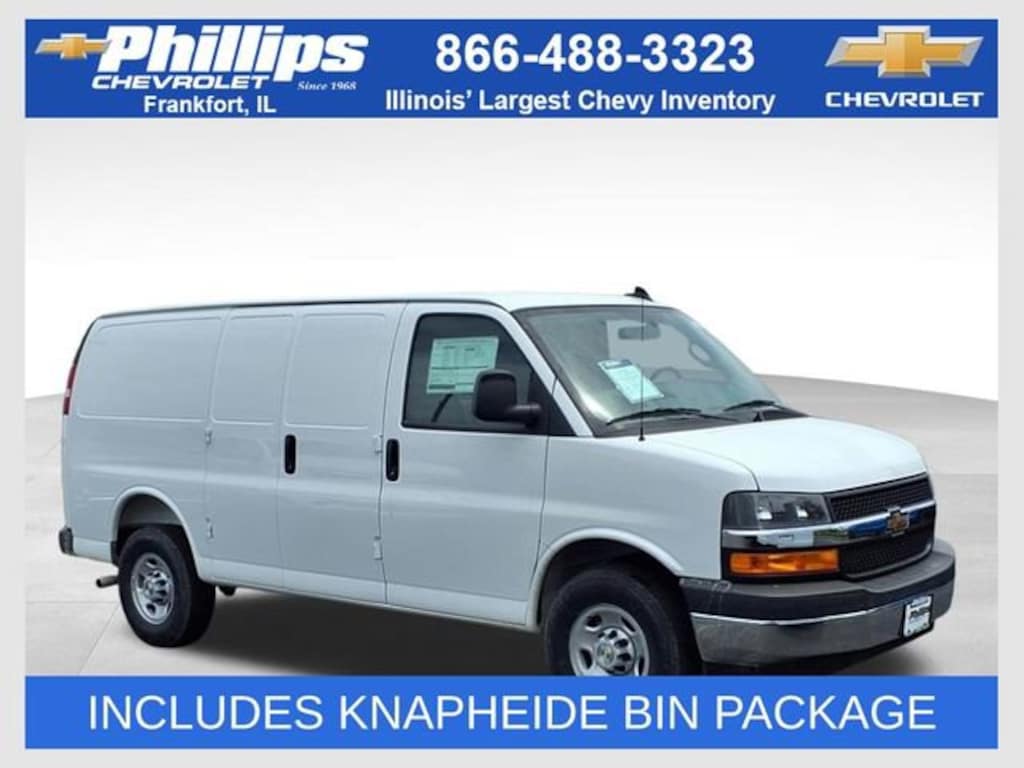 2025 Chevrolet Express 2500 Cargo Van, 6.6L gasoline V8. Cruise, tilt, chrome grill and bumpers. Trailering equipment. Locking Differential. Remote keyless entry. Includes a Knapheide shelving package with fiberglass partition, lockable door, portable tool boxes, storage bins. No rear or side cargo windows.
