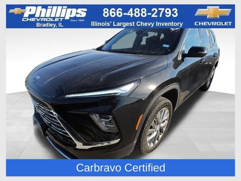 Carbravo Certified, One Owner, Apple CarPlay, Android Auto, Keyless Entry, AWD, Back Up Camera, Blind Spot Monitoring, Bluetooth, BOSE Audio, Cruise Control, Heated seats, Heated steering wheel, Forward Collision Alert, Intellibeam, Lane Assist, Power Locks, Power Seating, Power Windows, Push Button Start, Rear Traffic Alert, Remaining factory warranty, Remote start, Lane Change Alert, Carfax Buyback Guarantee, Enclave Preferred, 4D Sport Utility, 2.5L DOHC, 8-Speed Automatic, AWD, Ebony Twilight Metallic, Ebony w/Sky Cool Gray & Ebony Accents w/Leatherette Seat Trim, 3rd row seats: split-bench, 4-Wheel Disc Brakes, ABS brakes, AM/FM radio: SiriusXM with 360L, Auto High-beam Headlights, Auto-dimming door mirrors, Auto-dimming Rear-View mirror, Automatic temperature control, Bose Premium 12-Speaker Audio System, Brake assist, Compass, Deleted OnStar Basics, Driver 4-Way Power Lumbar Seat Adjuster, Driver 8-Way Power Seat Adjuster, Driver door bin, Driver vanity mirror, Electronic Stability Control, Four wheel independent suspension, Front Bucket Seats, Front Center Armrest, Front dual zone A/C, Front Mounting License Plate Bracket Package, Front Passenger 6-Way Power Seat Adjuster, Front reading lights, Fully automatic headlights, Heated door mirrors, Heated Driver and Front Passenger Seats, Heated steering wheel, Illuminated entry, Leather steering wheel, Leatherette Seat Trim, Navigation System, Outside temperature display, Overhead console, Passenger door bin, Power door mirrors, Power driver seat, Power Liftgate, Power passenger seat, Preferred Equipment Group 1SD, Radio data system, Radio: Infotainment Center, Rear air conditioning, Rear reading lights, Rear window defroster, Rear window wiper, Remote keyless entry, Security system, SiriusXM with 360L Trial Subscription, Speed control, Speed-sensing steering, Spoiler, Steering wheel mounted audio controls, Tachometer, Telescoping steering wheel, Traction control, Trip computer, Turn signal indicator mirrors, Variably intermittent wipers, Voltmeter, Wheels: 20 Alloy with Medium Android Finish, Wireless Apple CarPlay, Wireless Google Android Auto. CARFAX One-Owner. Clean CARFAX. Certified. Ebony Twilight Metallic 2025 Buick Enclave Preferred AWD 8-Speed Automatic 2.5L DOHCRecent Arrival!Certification Program Details: Type your description hereWith the internet today, a great value shouldn't be hard to find. Here at Phillips Chevrolet we do the research for you. We monitor the market daily to ensure our customers are getting the best value achievable. We price all of our vehicles to make the buying process as simple and easy as possible. Our internet prices are just one factor that makes us the #1, #2, and out to be the #3 Chevrolet dealerships in Illinois. The future #3 Chevy dealership in Illinois is conveniently located at 1400 Locke Drive, the corner of I-57 & IL 50, in Bradley/Bourbonnais, IL 60914.