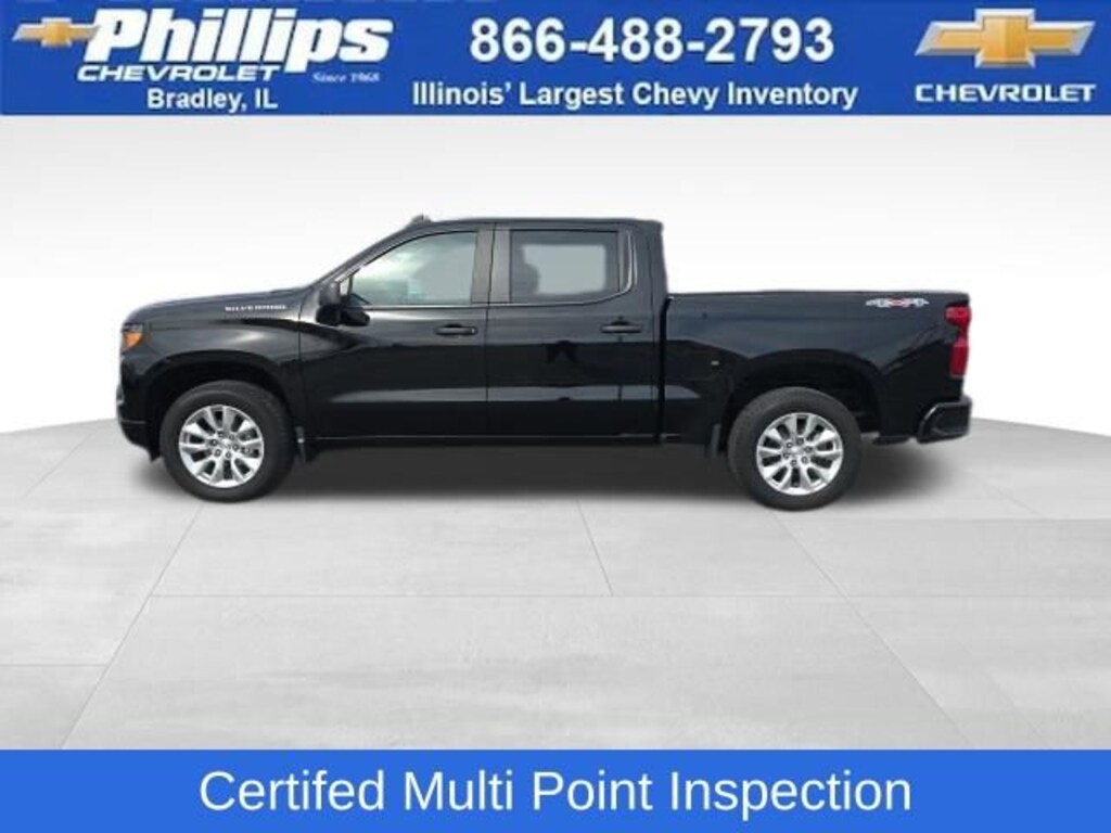 New Price! Carbravo Certified, Certifed Multi Point Inspection, One Owner, Carfax- Accident Free, Apple CarPlay, 4WD, Back Up Camera, Bluetooth, Cruise Control, Heated seats, Forward Collision Alert, Intellibeam, Power Locks, Power Seating, Power Windows, Push Button Start, Remote start, TURBO!, 20 Wheels, Carfax Buyback Guarantee, CUSTOM CONVENIENCE PACKAGE, CUSTOM VALUE PACKAGE, TRAILERING PACKAGE, Silverado 1500 Custom, 4D Crew Cab, 2.7L Turbo, 8-Speed Automatic, 4WD, Black, Black Cloth, 10-Way Power Driver Seat w/Lumbar, 120-Volt Bed Mounted Power Outlet, 120-Volt Instrument Panel Power Outlet, 3.42 Rear Axle Ratio, 3.5 Monochromatic Display Driver Info Center, 4-Wheel Disc Brakes, 6-Speaker Audio System, ABS brakes, Air Conditioning, AM/FM radio: SiriusXM, Apple CarPlay/Android Auto, Automatic Emergency Braking, Bluetooth® For Phone, Brake assist, Bumpers: body-color, Chevrolet Connected Access Capable, Cloth Seat Trim, Compass, Custom Convenience Package, Custom Value Package, Deep-Tinted Glass, Driver door bin, Driver vanity mirror, Dual front impact airbags, Dual front side impact airbags, Dual Rear USB Ports (Charge Only), Electric Rear-Window Defogger, Electrical Steering Column Lock, Electronic Cruise Control, Electronic Stability Control, EZ Lift Power Lock & Release Tailgate, Following Distance Indicator, Forward Collision Alert, Front anti-roll bar, Front Center Armrest w/Storage, Front Frame-Mounted Black Recovery Hooks, Front Pedestrian Braking, Front reading lights, Front wheel independent suspension, Fully automatic headlights, HD Rear Vision Camera, Heated door mirrors, High Capacity Suspension Package, Hitch Guidance, Illuminated entry, IntelliBeam Automatic High Beam On/Off, Lane Keep Assist w/Lane Departure Warning, LED Cargo Area Lighting, Low tire pressure warning, Manual Tilt Wheel Steering Column, Not Equipped w/Steering Column Lock, Occupant sensing airbag, OnStar & Chevrolet Connected Services Capable, Outside temperature display, Overhead airbag, Overhead console, Panic alarm, Passenger door bin, Passenger vanity mirror, Power door mirrors, Power driver seat, Power Front Windows w/Driver Express Up/Down, Power Front Windows w/Passenger Express Down, Power Rear Windows w/Express Down, Power steering, Power windows, Preferred Equipment Group 1CX, Premium audio system: Chevrolet Infotainment 3, Radio data system, Radio: Chevrolet Infotainment 3 System, Rear 60/40 Folding Bench Seat (Folds Up), Rear reading lights, Rear step bumper, Rear window defroster, Remote Keyless Entry, Remote Vehicle Starter System, Security system, SiriusXM Radio, Speed control, Speed-sensing steering, Standard Tailgate, Tachometer, Theft Deterrent System (Unauthorized Entry), Tilt steering wheel, Traction control, Trailering Package, Trip computer, Variably intermittent wipers, Voltmeter, Wheels: 20 x 9 Bright Silver Painted Aluminum, Wi-Fi Hot Spot Capable, Wireless Phone Projection. CARFAX One-Owner. Clean CARFAX. Certified. Black 2023 Chevrolet Silverado 1500 Custom 4WD 8-Speed Automatic 2.7L Turbo