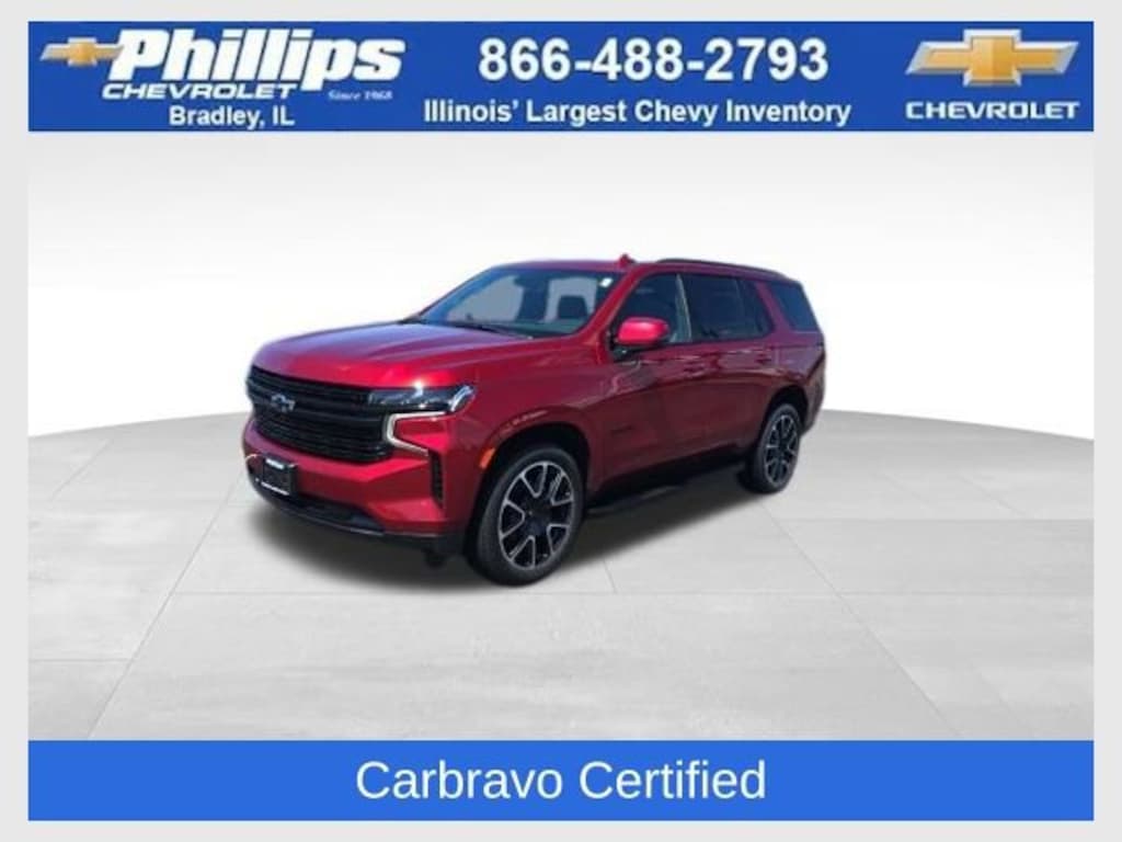 Carbravo Certified, One Owner, Apple CarPlay, Android Auto, Keyless Entry, 4WD, Adaptive Cruise Control (ACC), Back Up Camera, Blind Spot Monitoring, Bluetooth, BOSE Audio, Heated seats, Heated steering wheel, Forward Collision Alert, Lane Assist, Panoramic Roof, Pedestrian Monitoring, Power lift gate, Power Locks, Power Seating, Power Windows, Push Button Start, Rear Traffic Alert, Remote start, Front Park Assist, Rear Park Assist, Lane Change Alert, Carfax Buyback Guarantee, Tahoe RST, 4D Sport Utility, EcoTec3 6.2L V8, 10-Speed Automatic with Overdrive, 4WD, Radiant Red Tintcoat, Red Leather, 1st & 2nd Row Color-Keyed Carpeted Floor Mats, 2-Speed Active Electronic AutoTrac Transfer Case, 2nd Row Pwr Release 60/40 Split-Folding Bench Seat, 3.23 Rear Axle Ratio, 3rd Row 60/40 Power-Folding Split-Bench Seat, 4-Wheel Disc Brakes, Adaptive Cruise Control, Advanced Trailering Package, Apple CarPlay/Android Auto, Auto-Dimming Inside Rear-View Mirror, Bose 9-Speaker Stereo Audio System Feature, Brake assist, Bright Front & Rear Door Sill Plates, Color-Keyed Carpeting Floor Covering, Compass, Driver & Front Outboard Passenger Airbags, Driver Alert Package, Dual Exhaust System, Dual-Pane Power Panoramic Sunroof, Electronic Stability Control, Enhanced Automatic Emergency Braking, Enhanced Driver Information Center, Extra Capacity Cooling System, Floor Console w/Storage Area, Four wheel independent suspension, Garage door transmitter, Hands-Free Rear Power Programmable Liftgate, HD Surround Vision, Heated 2nd Row Outboard Seats, Heated door mirrors, Heated Steering Wheel, Hitch Guidance w/Hitch View, Infotainment Display, Integrated Trailer Brake Controller, Lane Change Alert w/Side Blind Zone Alert, LED Daytime Running Lamps, Luxury Package, Magnetic Ride Control Suspension, Max Trailering Package, Memory Settings, Memory Settings for Driver, Outside Heated Power-Adjustable Mirrors, Outside temperature display, Power Liftgate, Power Tilt & Telescopic Steering Column, Preferred Equipment Group 1SP, Rain sensing wipers, Rear Cross Traffic Alert, Rear Pedestrian Alert, Rear window wiper, Remote keyless entry, Remote Start, SiriusXM Radio w/360L, Smart Trailer Integration Indicator, Sport Performance Package, Steering wheel mounted audio controls, Traction control, Trip computer, Universal Home Remote, Variably intermittent wipers, Wheels: 22 x 9 Bright Machined, Wireless Charging, Wrapped Steering Wheel. CARFAX One-Owner. Clean CARFAX. Certified. Radiant Red Tintcoat 2023 Chevrolet Tahoe RST 4WD 10-Speed Automatic with Overdrive EcoTec3 6.2L V8Recent Arrival!Certification Program Details: Type your description hereWith the internet today, a great value shouldn't be hard to find. Here at Phillips Chevrolet we do the research for you. We monitor the market daily to ensure our customers are getting the best value achievable. We price all of our vehicles to make the buying process as simple and easy as possible. Our internet prices are just one factor that makes us the #1, #2, and out to be the #3 Chevrolet dealerships in Illinois. The future #3 Chevy dealership in Illinois is conveniently located at 1400 Locke Drive, the corner of I-57 & IL 50, in Bradley/Bourbonnais, IL 60914.