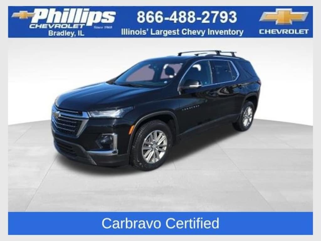 Carbravo Certified, One Owner, Apple CarPlay, Android Auto, Keyless Entry, AWD, Back Up Camera, Blind Spot Monitoring, Bluetooth, Heated seats, Forward Collision Alert, Intellibeam, Lane Assist, Power Locks, Power Seating, Power Windows, Push Button Start, Remaining factory warranty, Remote start, Trailering Equipment, Chevy Safety Assist Package, Pedestrian Detection, Lane Change Alert, Carfax Buyback Guarantee, Traverse LT 1LT, 4D Sport Utility, 3.6L V6 SIDI VVT, 9-Speed Automatic, AWD, Mosaic Black Metallic, Jet Black Cloth, 3.49 Axle Ratio, 6-Speaker Audio System Feature, 8-Way Power Driver Seat Adjuster, ABS brakes, Air Conditioning, AM/FM radio: SiriusXM, Apple CarPlay/Android Auto, Auto High-beam Headlights, Brake assist, Compass, Delay-off headlights, Dual front impact airbags, Dual front side impact airbags, Electronic Stability Control, Emergency communication system, Exterior Parking Camera Rear, Four wheel independent suspension, Front anti-roll bar, Front dual zone A/C, Fully automatic headlights, Garage door transmitter, Heated door mirrors, Heated Driver & Front Passenger Seats, Heavy-Duty Cooling System, Hitch Guidance w/Hitch View, Leather steering wheel, Low tire pressure warning, Occupant sensing airbag, Outside temperature display, Overhead airbag, Panic alarm, Passenger door bin, Power door mirrors, Power Driver Lumbar Control, Power Liftgate, Preferred Equipment Group 1LT, Premium Cloth Seat Trim, Rear anti-roll bar, Rear reading lights, Remote keyless entry, Security system, Speed control, Speed-sensing steering, Steering wheel mounted audio controls, Telescoping steering wheel, Tilt steering wheel, Traction control, Trailering Assist Guidelines, Trailering Equipment, Trip computer, Turn signal indicator mirrors, Voltmeter, Wheels: 18 Bright Silver-Painted Aluminum. CARFAX One-Owner. Clean CARFAX. Certified. Mosaic Black Metallic 2023 Chevrolet Traverse LT 1LT AWD 9-Speed Automatic 3.6L V6 SIDI VVT
