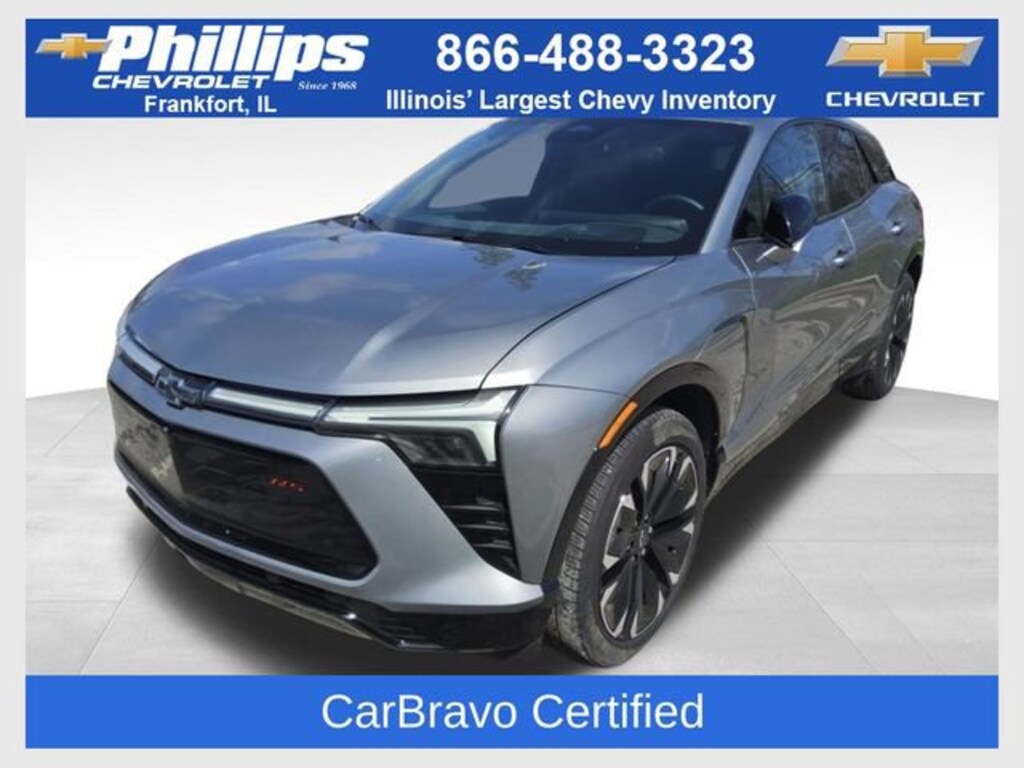 CarBravo Certified, AWD, Low Miles, Backup Camera, Remote Start, Pwr Dr Seat, Navigation, Heated Seats, Heated Steering Wheel, Ventilated Seats, Memory Seating, Power Liftgate, Apple CarPlay, Aluminum Wheels, Carfax Buyback Guarantee, Blazer EV RS, 4D Sport Utility, Electric Motor, 1-Speed Automatic, AWD, Sterling Gray Metallic, Black w/Evotex Seat Trim, 2-Way Power Driver Lumbar Seat Adjuster, 4-Wheel Disc Brakes, 6-Speaker Audio System Feature, 8-Way Power Driver Seat Adjuster, ABS brakes, Air Conditioning, AM/FM radio: SiriusXM with 360L, Auto High-beam Headlights, Auto-dimming door mirrors, Auto-dimming Rear-View mirror, Automatic temperature control, Brake assist, Bumpers: body-color, Compass, Driver & Front Passenger Ventilated Seats, Electronic Stability Control, Four wheel independent suspension, Front Bucket Seats, Front Center Armrest, Front dual zone A/C, Front Passenger 2-Way Power Lumbar Seat Adjuster, Front Passenger 6-Way Power Seat Adjuster, Fully automatic headlights, Garage door transmitter, Heated door mirrors, Heated Driver & Fr Passenger Seats Cushion & Seatback, Heated steering wheel, Illuminated entry, Memory seat, Navigation System, Outside temperature display, Overhead console, Passenger door bin, Perforated Suede/Evotex Seat Trim, Power door mirrors, Power Liftgate, Power passenger seat, Preferred Equipment Group 3RS, Radio: 17.7 Diagonal Advanced Color LCD Display, Rain sensing wipers, Rear seat center armrest, Rear window defroster, Rear window wiper, Remote keyless entry, Ride & Handling Suspension, Security system, SiriusXM w/360L Trial Subscription, Speed control, Spoiler, Sport steering wheel, Steering wheel mounted audio controls, Telescoping steering wheel, Tilt steering wheel, Traction control, Trip computer, Turn signal indicator mirrors, Variably intermittent wipers, Wheels: 21 Machined-Face Aluminum. 2025 Chevrolet Blazer EV Sterling Gray Metallic RS 4D Sport Utility AWD 1-Speed Automatic 102/87 City/Highway MPG Electric Motor102/87 City/Highway MPG Recent Arrival!Certification Program Details: Type your description hereWith the internet today, a great value shouldnât be hard to find. Here at Phillips Chevrolet we do the research for you. We monitor the market daily to ensure our customers are getting the best value achievable. We price all of our vehicles to make the buying process as simple and easy as possible. Our internet prices are just one factor that makes us the #1, #2, and out to be the #3 Chevrolet dealerships in Illinois. The #2 Chevy dealership in Illinois is conveniently located just a one block south of 80/94, at 17730 S Torrence Avenue in Lansing, IL 60438.