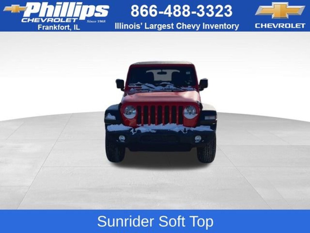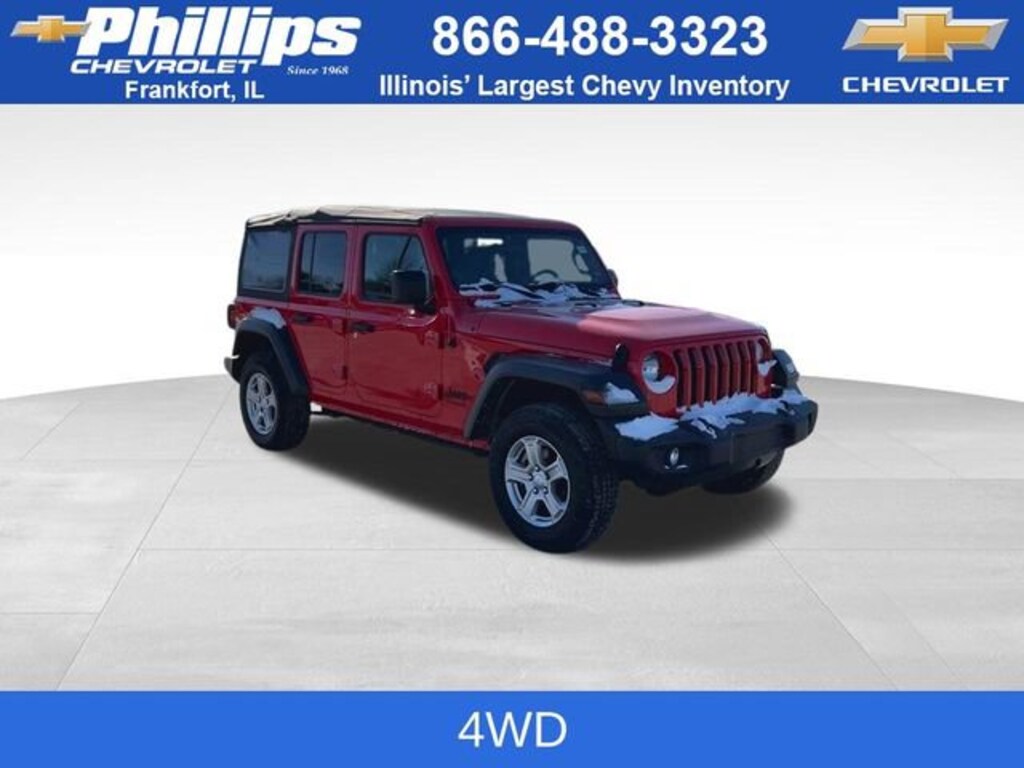 CarBravo Certified, 4WD, Sunrider Soft Top, Backup Camera, Remote Start, Apple CarPlay, Aluminum Wheels, Carfax Buyback Guarantee, Wrangler Unlimited Sport S, 4D Sport Utility, 2.0L I4 DOHC, 8-Speed Automatic, 4WD, Firecracker Red Clearcoat, Black w/Cloth Low-Back Bucket Seats, 110 MPH Vehicle Max Speed Calibration, 2-Door Passive Entry, Front Door Locks, 3.45 Rear Axle Ratio, 4-Wheel Disc Brakes, 8 Speakers, ABS brakes, Air Conditioning w/Auto Temperature Control, Air Filtering, AM/FM radio, Apple CarPlay/Android Auto, Automatic Headlamps, Aux Battery, Brake assist, Cloth Low-Back Bucket Seats, Cluster 7.0 TFT Color Display, Compass, Convenience Group, Deep Tint Sunscreen Windows, Delay-off headlights, Driver door bin, Driver vanity mirror, Dual front impact airbags, Dual front side impact airbags, Electronic Stability Control, Engine Oil Cooler, Front 1-Touch Down Power Windows, Front anti-roll bar, Front Center Armrest w/Storage, Front fog lights, Front reading lights, Integrated roll-over protection, Leather Wrapped Steering Wheel, Low tire pressure warning, Normal Duty Suspension, Occupant sensing airbag, Outside temperature display, ParkView Rear Back-Up Camera, Passenger door bin, Passenger vanity mirror, Power Heated Mirrors, Quick Order Package 22S Sport S, Radio data system, Radio: Uconnect 4 w/7 Display, Rear anti-roll bar, Rear reading lights, Remote Keyless Entry, Security Alarm, SiriusXM Satellite Radio, Speed control, Speed Sensitive Power Locks, Split folding rear seat, Sport S, Steering wheel mounted audio controls, Stop-Start Dual Battery System, Sun Visors w/Illuminated Vanity Mirrors, Tachometer, Technology Group, Telescoping steering wheel, Tilt steering wheel, Traction control, Trip computer, Universal Garage Door Opener, Variably intermittent wipers, Wheels: 17 x 7.5 Tech Silver Aluminum. 2022 Jeep Wrangler Firecracker Red Clearcoat Unlimited Sport S 4D Sport Utility 4WD 8-Speed Automatic 21/24 City/Highway MPG 2.0L I4 DOHCCertification Program Details: Type your description hereWith the internet today, a great value shouldnât be hard to find. Here at Phillips Chevrolet we do the research for you. We monitor the market daily to ensure our customers are getting the best value achievable. We price all of our vehicles to make the buying process as simple and easy as possible. Our internet prices are just one factor that makes us the #1, #2, and out to be the #3 Chevrolet dealerships in Illinois. The #2 Chevy dealership in Illinois is conveniently located just a one block south of 80/94, at 17730 S Torrence Avenue in Lansing, IL 60438.
