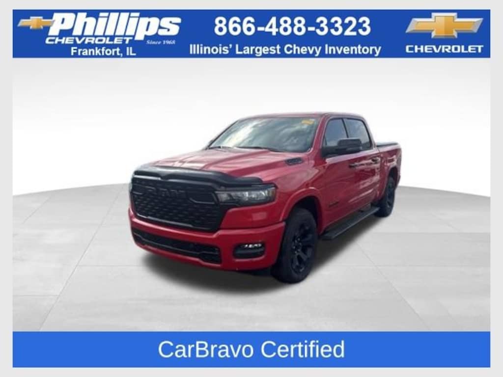 CarBravo Certified, Bucket Seats w/ Center Console, 4WD, Panoramic Roof, Night Edition, Trailering Package, Backup Camera, Carfax Buyback Guarantee, 1500 Big Horn/Lone Star, 4D Crew Cab, 3.0L I6, 8-Speed Automatic, 4WD, Flame Red Clearcoat, Black w/Cloth High-Back Bucket Seats, 115V Auxiliary Power Outlet, 115V Auxiliary Rear Power Outlet, 12 Touchscreen Display, 2nd Row In Floor Storage Bins, 3.55 Rear Axle Ratio, 4-Wheel Disc Brakes, 400W Inverter, 4G LTE Wi-Fi Hot Spot, 9 Amplified Speakers w/Subwoofer, ABS brakes, Accent Color Door Handles, Accent Color Premium Power Mirrors, Accent Color Tailgate Handle, Air Conditioning ATC w/Dual Zone Control, AM/FM radio, Anti-Spin Differential Rear Axle, Apple CarPlay, Auto High-beam Headlights, Auto Power-Folding Mirrors, Auto-Dimming Exterior Driver Mirror, Auto-Dimming Rear-View Mirror, Big Horn Level 2 Equipment Group, Black Exterior Mirrors, Black Exterior Truck Badging, Black Headlamp Bezels, Black Interior Accents, Black Painted Exterior Mirrors Caps, Black Premium Power Mirrors, Black Tail Lamp Bezels, Body Color Front Bumper, Body Color Rear Bumper w/Step Pads, Brake assist, Bucket Seats, Cluster 7.0 TFT Color Display, Compass, Configurable Drive Mode, Connected Travel & Traffic Services, Connectivity - US/Canada, Convex Wide-Angle Exterior Mirror Insert, Deluxe Cloth Bucket Seats, Dome Dual LED Reading Lamp, Dual-Pane Panoramic Sunroof, Electronic Stability Control, Exterior Mirrors Courtesy Lamps, Exterior Mirrors w/Heating Element, Exterior Mirrors w/Supplemental Signals, Front Center Armrest w/Storage, Front fog lights, Front Seat Back Map Pockets, Full Length Floor Console, Fully automatic headlights, Glove Box Lamp, Google Android Auto, GPS Antenna Input, GPS Navigation, Grille Black Surround Black Mesh, HD Radio, Heated Front Seats, Heated Steering Wheel, Illuminated entry, Integrated Voice Command w/Bluetooth, Leather Wrapped Steering Wheel, LED Dome Lamp w/On/Off Switch, LED Footwell Lighting, Manual Folding Exterior Mirrors, Media Hub w/2 Charge Only USBs, Night Edition, Outside temperature display, Overhead console, Overhead LED Lamps, Panic alarm, ParkView Rear Back-Up Camera, Passenger door bin, Power 2-Way Driver Lumbar Adjust, Power Adjust 8-Way Driver Seat, Power Adjustable Pedals, Power door mirrors, Premium Overhead Console, Quick Order Package 21Z Big Horn, Radio: Uconnect 5 Nav w/12.0 Display, RAM Grille Badge - Black, Rear Power Sliding Window, Rear step bumper, Rear Window Defroster, Remote Tailgate Release, Security Alarm, SiriusXM w/360L, Speed control, Split folding rear seat, Steering Wheel Mounted Audio Controls, Sun Visors w/Illuminated Vanity Mirrors, Tachometer, Telescoping steering wheel, Tilt steering wheel, Traction control, Trailer Brake Control, Trip computer, Universal Garage Door Opener, USB Host Flip, Voltmeter, Wheels: 20 x 9.0 Aluminum Painted Clad. 2025 Ram 1500 Flame Red Clearcoat Big Horn/Lone Star 4D Crew Cab 4WD 8-Speed Automatic 17/24 City/Highway MPG 3.0L I6Recent Arrival!Certification Program Details: Type your description hereWith the internet today, a great value shouldnât be hard to find. Here at Phillips Chevrolet we do the research for you. We monitor the market daily to ensure our customers are getting the best value achievable. We price all of our vehicles to make the buying process as simple and easy as possible. Our internet prices are just one factor that makes us the #1, #2, and out to be the #3 Chevrolet dealerships in Illinois. The #2 Chevy dealership in Illinois is conveniently located just a one block south of 80/94, at 17730 S Torrence Avenue in Lansing, IL 60438.