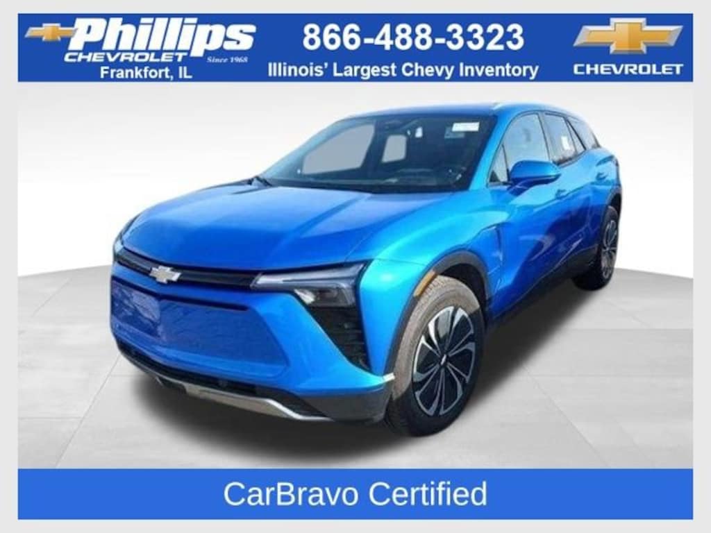 CarBravo Certified, AWD, Trailering Package, Backup Camera, Remote Start, Pwr Dr Seat, Navigation, Side Blind Zone Alert, Adaptive Cruise Control, Heated Seats, Heated Steering Wheel, Power Liftgate, Apple CarPlay, Aluminum Wheels, Carfax Buyback Guarantee, Blazer EV LT, 4D Sport Utility, Electric Motor, 1-Speed Automatic, AWD, Riptide Blue Metallic, Black w/Evotex Seat Trim, 2-Way Power Driver Lumbar Seat Adjuster, 2-Way Power Passenger Lumbar Seat Adjuster, 4-Wheel Disc Brakes, 6-Speaker Audio System Feature, 6-Way Power Passenger Seat Adjuster, 8-Way Power Driver Seat Adjuster, ABS brakes, Adaptive Cruise Control, Air Conditioning, AM/FM radio: SiriusXM with 360L, Auto High-beam Headlights, Automatic temperature control, Brake assist, Comfort & Convenience Package, Compass, Convenience & Driver Confidence Package, Electronic Stability Control, Enhanced Automatic Emergency Braking, Evotex Seat Trim, Four wheel independent suspension, Front Bucket Seats, Fully automatic headlights, HD Surround Vision, Heated Driver & Fr Passenger Seats Cushion & Seatback, Heated Steering Wheel, Hitch Guidance, Hitch View, Illuminated entry, Inside Rear-View Auto-Dimming Mirror, Intersection Automatic Emergency Braking, Navigation System, Outside temperature display, Overhead console, Power-Adjustable Power-Folding Heated Mirrors, Preferred Equipment Group 2LT, Programmable Hands Free AutoSense Power Liftgate, Radio: 17.7 Diagonal Advanced Color LCD Display, Rear Pedestrian Alert, Rear window defroster, Rear window wiper, Remote keyless entry, Reverse Automatic Braking, Ride & Handling Suspension, Satin Aluminum Finish Roof Rails, Security system, Side Bicyclist Alert, SiriusXM w/360L, Split folding rear seat, Spoiler, Steering wheel mounted audio controls, Telescoping steering wheel, Tilt steering wheel, Traction control, Trip computer, Variably intermittent wipers, Wheels: 19 Machined-Face Aluminum w/Painted Pockets, Wireless Phone Charging, Wrapped Steering Wheel. 2024 Chevrolet Blazer EV Riptide Blue Metallic LT 4D Sport Utility AWD 1-Speed Automatic 103/88 City/Highway MPG Electric Motor