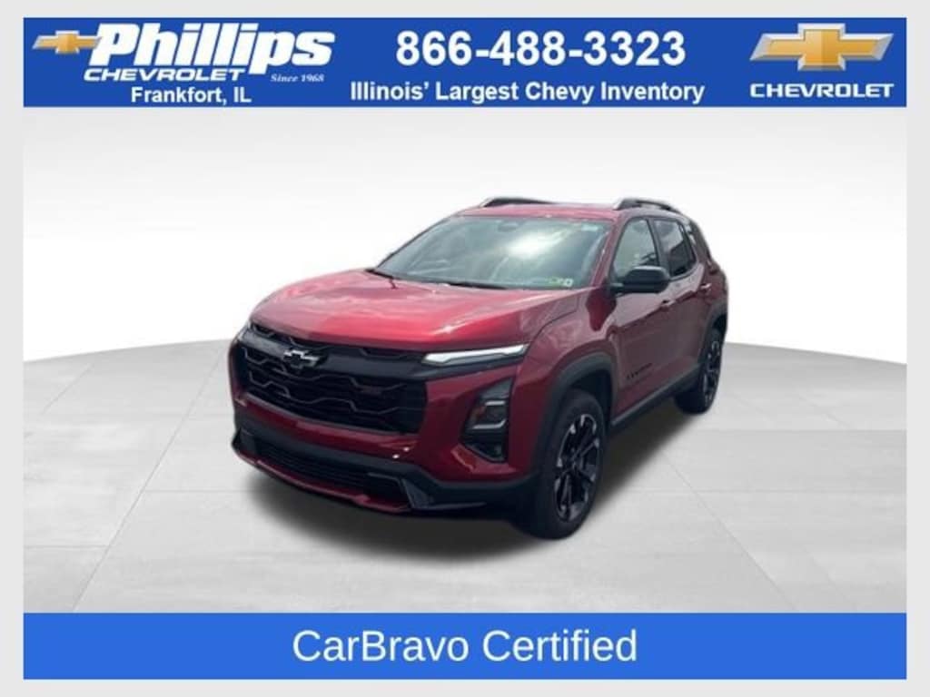 CarBravo Certified, Low Miles, Backup Camera, Remote Start, Pwr Dr Seat, Forward Collision Alert, Navigation, Heated Seats, Power Liftgate, Apple CarPlay, Aluminum Wheels, Carfax Buyback Guarantee, Equinox RS, 4D Sport Utility, 1.5L DOHC, CVT, FWD, Radiant Red Tintcoat, Black w/Red Accents w/Evotex Seat Trim, 2-Way Power Driver Lumbar Control Seat Adjuster, 4-Wheel Disc Brakes, 6 Speakers, ABS brakes, Air Conditioning, AM/FM radio: SiriusXM, Auto High-beam Headlights, Automatic temperature control, Brake assist, Bumpers: body-color, Compass, Driver 8-Way Power Seat Adjuster, Electronic Stability Control, Evotex Seat Trim, Four wheel independent suspension, Front Bucket Seats, Front Center Armrest, Front dual zone A/C, Front Fog Lamps, Front Passenger 4-Way Manual Seat Adjuster, Fully automatic headlights, Garage door transmitter, HD Surround Vision, Heated door mirrors, Heated Driver & Front Passenger Seats, Horizontal Cargo Net (LPO), Illuminated entry, Navigation System, Outside temperature display, Overhead console, Passenger door bin, Power door mirrors, Power driver seat, Power Liftgate, Preferred Equipment Group 1RS, Premium audio system: Chevrolet Infotainment 3, Radio data system, Radio: 11.3 Diagonal Advanced Color LCD Display, Rain sensing wipers, Rear Camera Mirror Washer, Rear Pedestrian Alert, Rear seat center armrest, Rear window defroster, Rear window wiper, Remote keyless entry, Retractable Cargo Shade, Safety & Technology Package, Security system, SiriusXM, Speed control, Speed-sensing steering, Split folding rear seat, Spoiler, Sport steering wheel, Steering wheel mounted audio controls, Tachometer, Telescoping steering wheel, Tilt steering wheel, Traction control, Traffic Sign Recognition, Trip computer, Universal Home Remote Non-Functional, Variably intermittent wipers, Wheels: 19 Carbon Flash Metallic Aluminum. 2025 Chevrolet Equinox Radiant Red Tintcoat RS 4D Sport Utility FWD CVT 26/28 City/Highway MPG 1.5L DOHC