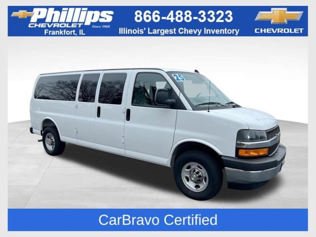 CarBravo Certified, Low Miles, Backup Camera, Pwr Dr Seat, Forward Collision Alert, Apple CarPlay, Carfax Buyback Guarantee, Express 3500 LT Passenger, Extended Passenger Van, 6.6L V8, Automatic with Overdrive, RWD, Summit White, Medium Pewter w/Custom Cloth Seat Trim, 12-Passenger Seating (2-3-3-4 Seating Config), 2 Speakers, 3rd row seats: bench, 4-Wheel Disc Brakes, 4th-Row Bench Seat, ABS brakes, Air Conditioning, AM/FM Stereo w/MP3 Player, Bumpers: chrome, Chrome Appearance Package, Chrome Grille, Compass, Custom Cloth Seat Trim, Deluxe Console w/Swing Out Storage Bin, Driver door bin, Driver vanity mirror, Driver's Seat Mounted Armrest, Dual front impact airbags, Dual front side impact airbags, Electronic Stability Control, Forward Collision Alert, Front & Rear Chrome Bumpers w/Step-Pad, Front anti-roll bar, Front Bucket Seats, Front reading lights, Front wheel independent suspension, Full-Floor Color-Keyed Carpeting, Fully automatic headlights, Heated door mirrors, Illuminated entry, Lane Departure Warning System, Low tire pressure warning, Occupant sensing airbag, Overhead airbag, Passenger cancellable airbag, Passenger door bin, Passenger seat mounted armrest, Passenger vanity mirror, Power door mirrors, Preferred Equipment Group 1LT, Rear air conditioning, Rear reading lights, Reclining Front Bucket Seats w/Inboard Armrests, Remote Keyless Entry, Security system, Speed control, Tachometer, Theft Alarm Notification, Tilt steering wheel, Traction control, Trip computer, Variably intermittent wipers, Voltmeter, Wheel Trim w/Chrome Center Caps. 2025 Chevrolet Express 3500 Summit White LT Extended Passenger Van Passenger RWD Automatic with Overdrive 6.6L V8