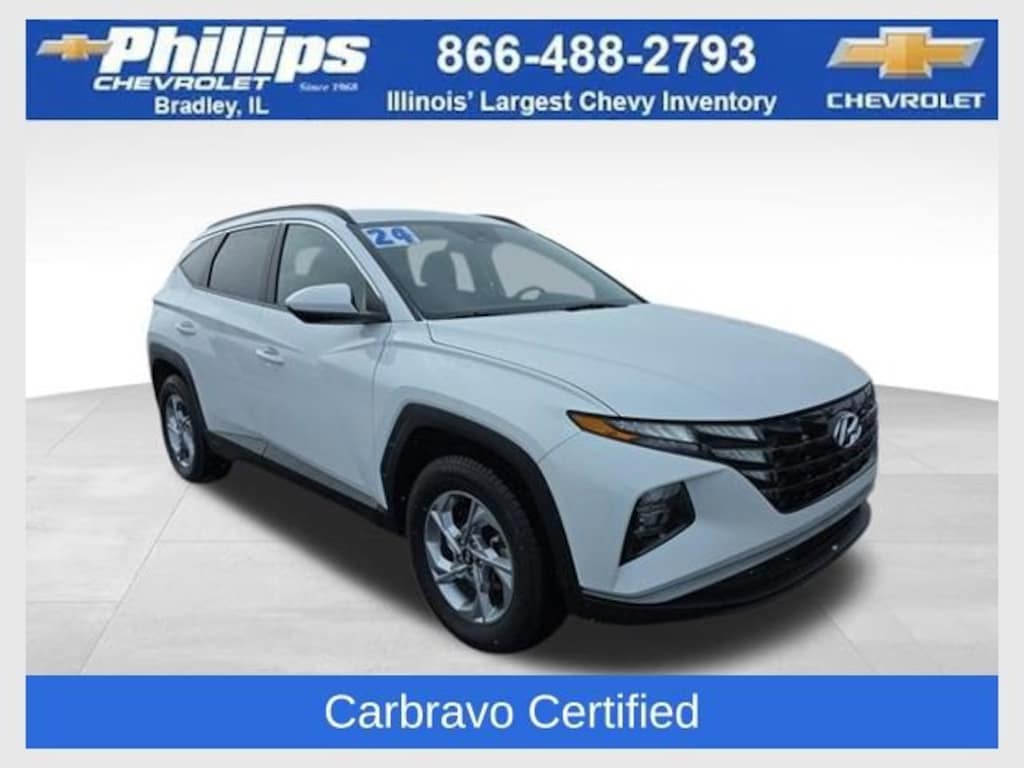 Carbravo Certified, Certifed Multi Point Inspection, One Owner, Carfax- Accident Free, Apple CarPlay, Android Auto, Keyless Entry, AWD, Back Up Camera, Bluetooth, Hands-Free Easy Open Power Liftgate, Heated seats, Forward Collision Alert, Power Locks, Power Seating, Power Windows, Push Button Start, Rear Traffic Alert, Remote start, Side Blind Zone Alert, Lane Change Alert, Carfax Buyback Guarantee, Smart cruise control, Tucson SEL, 4D Sport Utility, 2.5L I4 DGI DOHC 16V LEV3-SULEV30 187hp, 8-Speed Automatic with SHIFTRONIC, AWD, White Pearl, Gray w/Stain & Odor Resistant Cloth Seat Trim, ABS brakes, All Season Fitted Liners, AM/FM radio: SiriusXM, Apple CarPlay & Android Auto, Auto High-beam Headlights, Auto-Dimming Rearview Mirror w/HomeLink, Automatic temperature control, Brake assist, Bumpers: body-color, Delay-off headlights, Driver door bin, Driver vanity mirror, Dual front impact airbags, Dual front side impact airbags, Electronic Stability Control, Exterior Parking Camera Rear, First Aid Kit, Four wheel independent suspension, Front anti-roll bar, Front Bucket Seats, Front Center Armrest, Front dual zone A/C, Front reading lights, Fully automatic headlights, Heated door mirrors, Heated Front Bucket Seats, Illuminated entry, Low tire pressure warning, Occupant sensing airbag, Option Group 01, Outside temperature display, Overhead airbag, Overhead console, Panic alarm, Passenger door bin, Passenger vanity mirror, Power door mirrors, Power Liftgate, Radio: AM/FM/HD Audio System, Rear anti-roll bar, Rear Bumper Applique, Rear seat center armrest, Rear side impact airbag, Rear window defroster, Rear window wiper, Remote keyless entry, Roof Rack Cross Rails, Roof rack: rails only, Security system, Speed control, Split folding rear seat, Spoiler, Stain & Odor Resistant Cloth Seat Trim, Steering wheel mounted audio controls, Tachometer, Telescoping steering wheel, Tilt steering wheel, Traction control, Trip computer, Variably intermittent wipers. CARFAX One-Owner. Clean CARFAX. Certified. White Pearl 2024 Hyundai Tucson SEL AWD 8-Speed Automatic with SHIFTRONIC 2.5L I4 DGI DOHC 16V LEV3-SULEV30 187hpOdometer is 20474 miles below market average! 23/29 City/Highway MPGCertification Program Details: Type your description hereWith the internet today, a great value shouldn't be hard to find. Here at Phillips Chevrolet we do the research for you. We monitor the market daily to ensure our customers are getting the best value achievable. We price all of our vehicles to make the buying process as simple and easy as possible. Our internet prices are just one factor that makes us the #1, #2, and out to be the #3 Chevrolet dealerships in Illinois. The future #3 Chevy dealership in Illinois is conveniently located at 1400 Locke Drive, the corner of I-57 & IL 50, in Bradley/Bourbonnais, IL 60914.