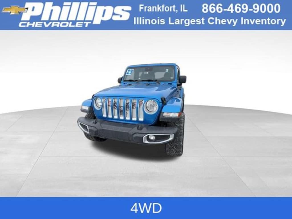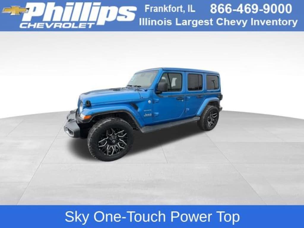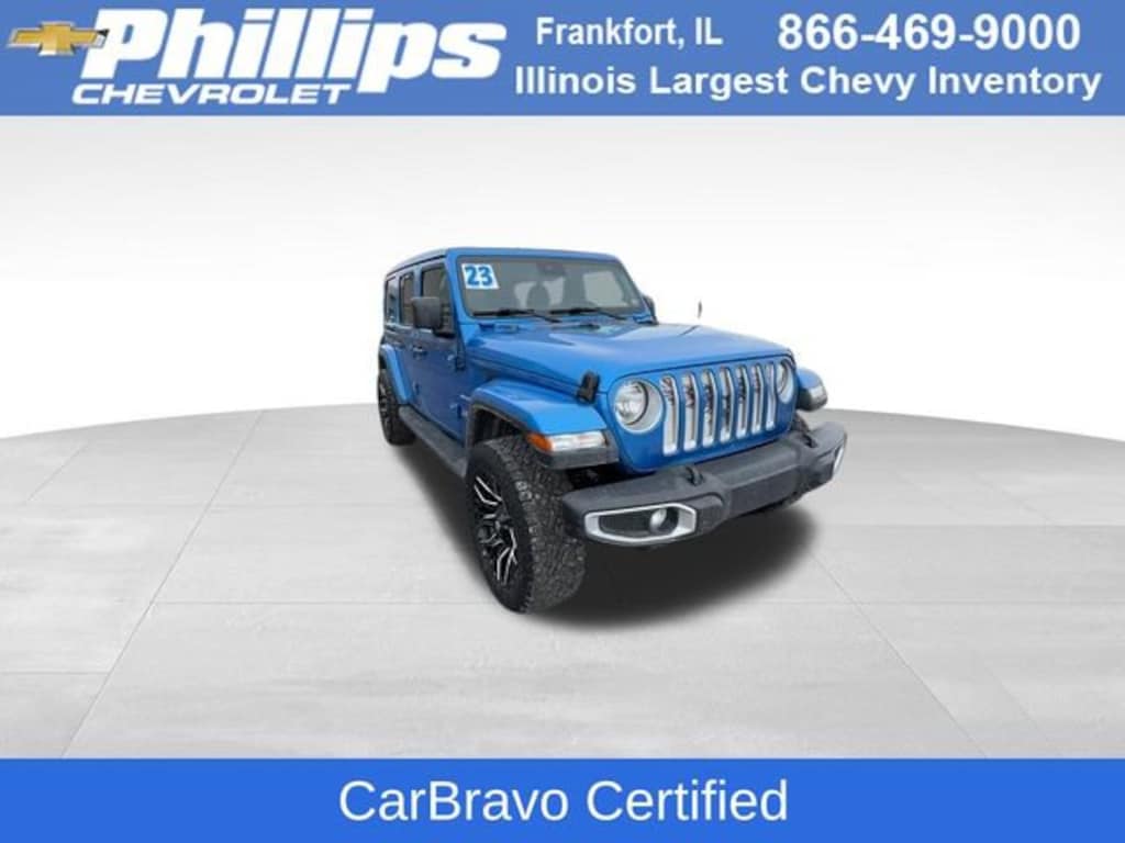 CarBravo Certified, 4WD, Sky One-Touch Power Top, Backup Camera, Remote Start, Forward Collision Alert, Side Blind Zone Alert, Rear Park Assist, Adaptive Cruise Control, Heated Seats, Heated Steering Wheel, Apple CarPlay, Aluminum Wheels, Carfax Buyback Guarantee, Wrangler Sahara, 4D Sport Utility, 2.0L I4 DOHC, 8-Speed Automatic, 4WD, Hydro Blue Pearlcoat, Black w/Cloth Low-Back Bucket Seats, 3.45 Overall Top Gear Ratio, 4-Wheel Disc Brakes, 9 Speakers, ABS brakes, Advanced Brake Assist, Advanced Safety Group, Air Conditioning, Alloy wheels, AM/FM radio: SiriusXM, Apple CarPlay/Android Auto, Auto High Beam Headlamp Control, Auto-dimming Rear-View mirror, Automatic temperature control, Blind Spot & Cross Path Detection, Brake assist, Cloth Low-Back Bucket Seats, Cold Weather Group, Compass, Driver door bin, Driver vanity mirror, Dual front impact airbags, Dual front side impact airbags, Electronic Stability Control, Emergency communication system: SiriusXM Guardian, Front anti-roll bar, Front Center Armrest w/Storage, Front dual zone A/C, Front fog lights, Front reading lights, Full Speed Forward Collision Warning Plus, Fully automatic headlights, Garage door transmitter, Heated door mirrors, Heated Front Seats, Heated Steering Wheel, Heavy Duty Suspension w/Gas Shocks, Illuminated entry, Integrated roll-over protection, Low tire pressure warning, Navigation System, Occupant sensing airbag, Outside temperature display, ParkSense Rear Park Assist System, ParkView Rear Back-Up Camera, Passenger door bin, Passenger vanity mirror, Power door mirrors, Power Top Quarter Window Storage Bag, Quick Order Package 22G Sahara, Radio data system, Radio: Uconnect 4C Nav w/8.4 Display, Rear anti-roll bar, Rear reading lights, Remote keyless entry, Remote Start System, Removable Rear Quarter Windows, Safety Group, Security system, Sky 1-Touch Power Top, Speed control, Split folding rear seat, Steering wheel mounted audio controls, Stop-Start Dual Battery System, Tachometer, Telescoping steering wheel, Tilt steering wheel, Traction control, Trip computer, Variably intermittent wipers, Voltmeter. 2023 Jeep Wrangler Hydro Blue Pearlcoat Sahara 4D Sport Utility 4WD 8-Speed Automatic 21/24 City/Highway MPG 2.0L I4 DOHCCertification Program Details: Type your description hereWith the internet today, a great value shouldnât be hard to find. Here at Phillips Chevrolet we do the research for you. We monitor the market daily to ensure our customers are getting the best value achievable. We price all of our vehicles to make the buying process as simple and easy as possible. Our internet prices are just one factor that makes us the #1, #2, and out to be the #3 Chevrolet dealerships in Illinois. The #2 Chevy dealership in Illinois is conveniently located just a one block south of 80/94, at 17730 S Torrence Avenue in Lansing, IL 60438.