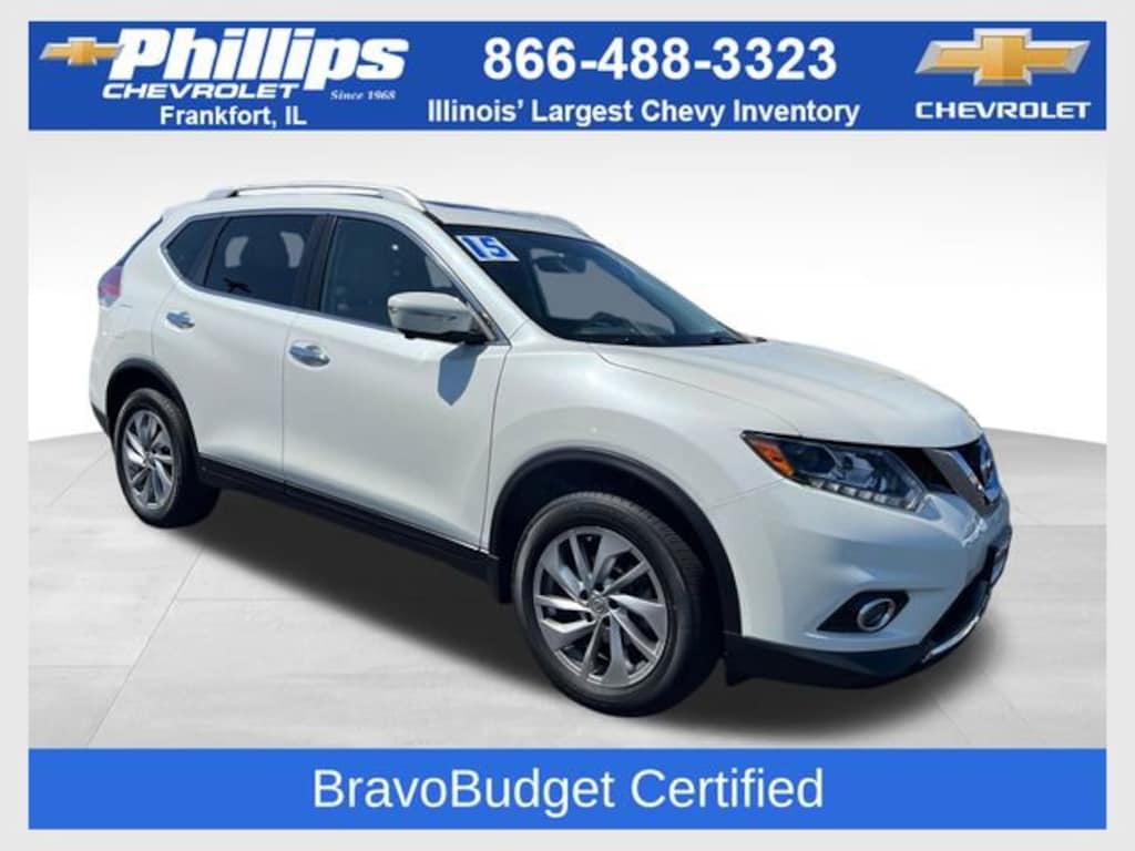 BravoBudget Certified, AWD, Panoramic Roof, Backup Camera, Pwr Dr Seat, Forward Collision Alert, Bose Audio, Side Blind Zone Alert, Lane Departure Warning, Heated Seats, Power Liftgate, Carfax Buyback Guarantee, Rogue SL, 4D Sport Utility, 2.5L I4 DOHC 16V, CVT with Xtronic, AWD, Pearl White, Almond Leather, 18 Alloy Wheels, 4-Wheel Disc Brakes, 5.694 Axle Ratio, AM/FM radio: SiriusXM, Automatic temperature control, Brake assist, Electronic Stability Control, Exterior Parking Camera Rear, LED Headlights, Power driver seat, Power Liftgate, Power Panoramic Moonroof, Rear window defroster, Remote keyless entry, SL Premium Package, Steering wheel mounted audio controls. 2015 Nissan Rogue Pearl White SL 4D Sport Utility AWD CVT with Xtronic 25/32 City/Highway MPG 2.5L I4 DOHC 16V
