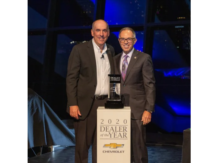 For 19 years, Phillips Chevrolet has been awarded General Motors, "Dealer of the Year Award" for outstanding sales, customer satisfaction and service to the surrounding community. Pictured from left to right: Steve Hill, North America Vice President at General Motors, Curtis Pascarella, Phillips Chevrolet President.