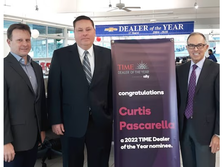 Phillips Chevrolet's President Curtis Pascarella, was nominated for the TIME dealer of the Year award. This award is one of the automobile industry's most prestigious and highly coveted honors, recognizing the nation's most successful auto dealers who also demonstrate a long-standing commitment to community service. Pictured from left to right: Bryan E. Tomky, Senior Account Executive with Ally; Michael Farrand, Executive Director - Sales with Ally; Curtis Pascarella, Phillips Chevrolet President.